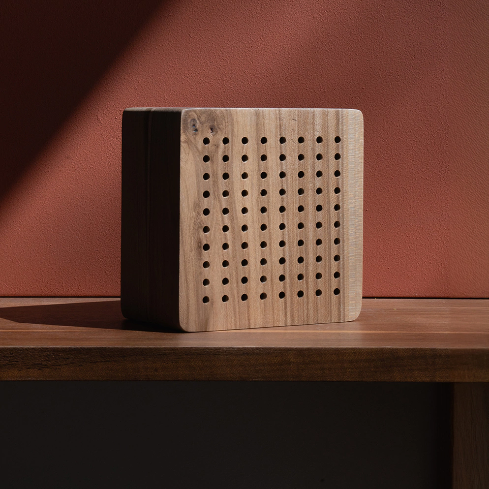 amplificador acústico de maderamaterial. peteribimedida. 13x13x8–no posee parlante electrico.Amplifica el sonido del celular.