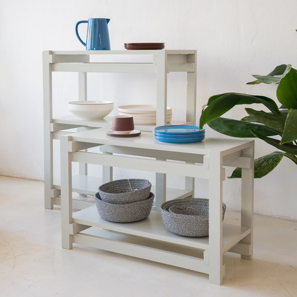 Estantería modular realizada en madera maciza de eucalipto.